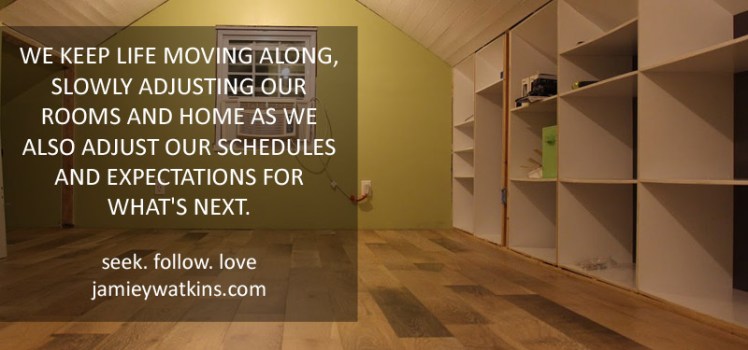 We finish off small projects long put off: filing bills and mending ripped clothing, hanging our diplomas and professional certificates on the walls. We close an old credit card and bank account. We weed and do laundry, cook and do the dishes. We keep life moving along, slowly adjusting our rooms and home as we also adjust our schedules and expectations for what’s next.
