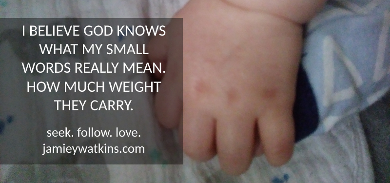 It’s okay, I think. I believe God knows what my small words really mean. How much weight they carry; how much meaning they shoulder. I think he knows — even better than I do — what I’m actually feeling and trying to say. And he knows why these short prayers are the best I can do: because I’m weary of life’s complications, like disappointments and anxiety and misunderstandings, like financial stress and endless to-do lists and missed opportunities, like viruses and cancer and grief.