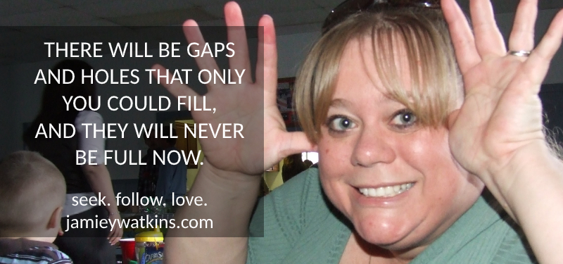 Instead, there will be a longing, an absence in our hearts as things go on without you. There will be confusion and disbelief as we figure out how to grieve you. There will be gaps and holes that only you could fill, and they will never be full now.
